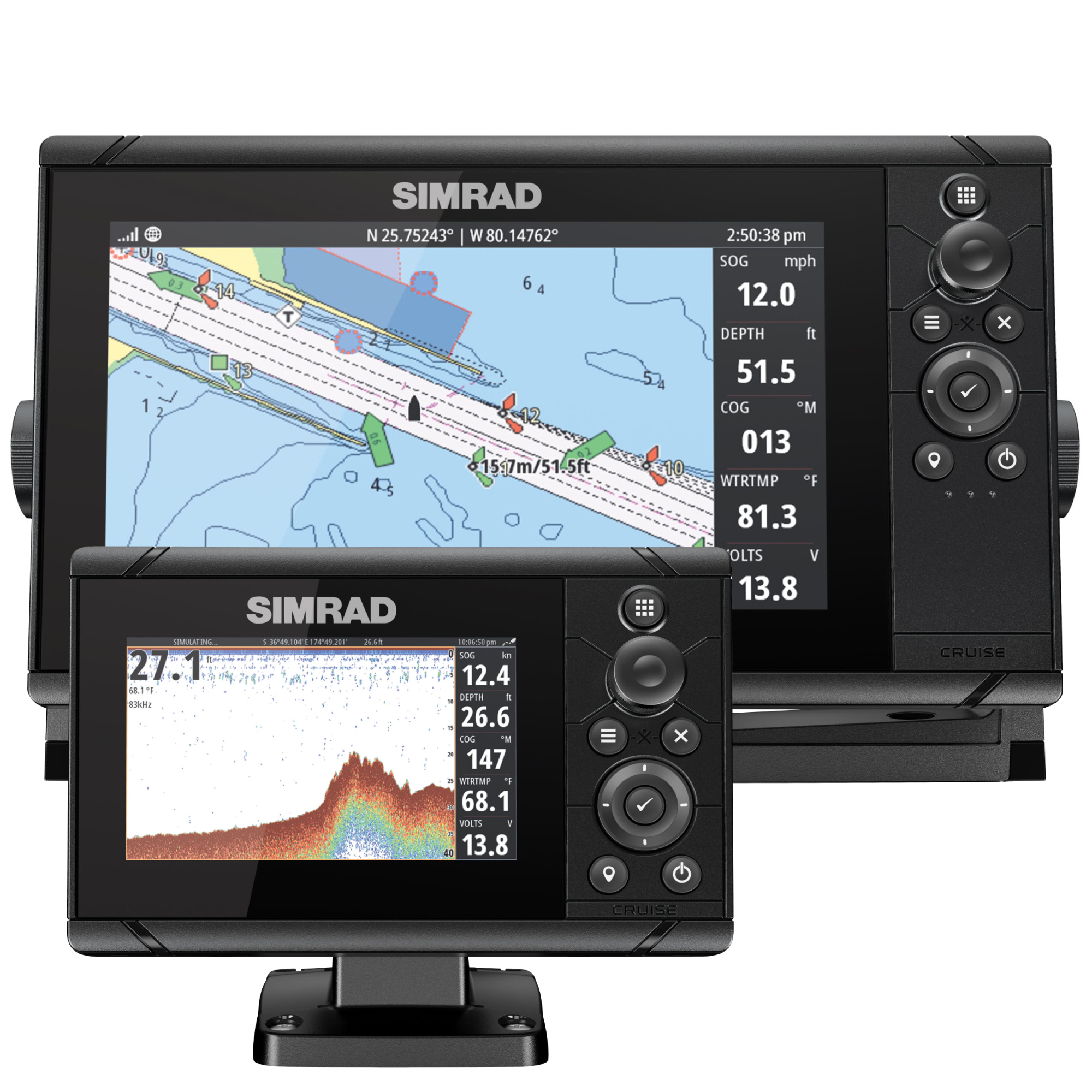 Картплоттер Cruise 5 от Simrad не только обеспечивает детальную навигацию, но и отображает четкие изображения подводного мира. Благодаря точному кнопочному управлению вы можете быстро и надежно управлять моторами серии Simrad Cruise даже во время дождя.