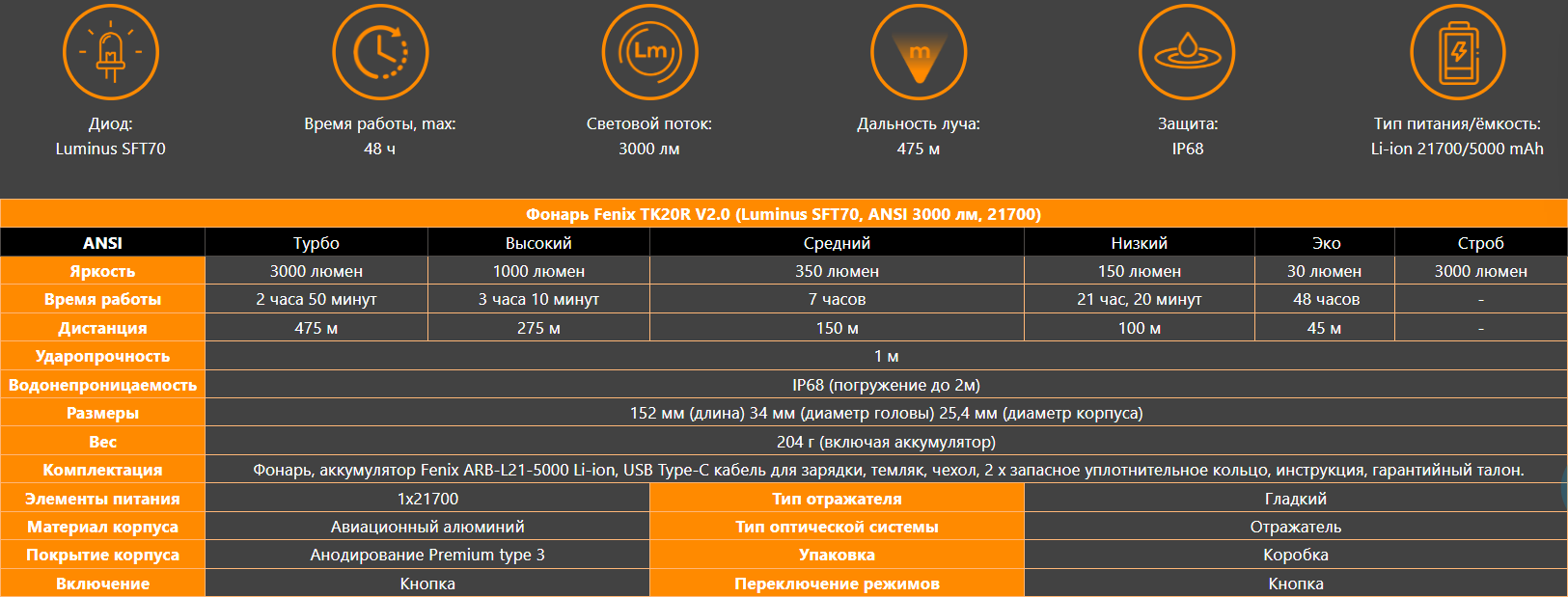 Фонарь модели Fenix TK20R V2.0, батарейка ARB-L21-5000 V2.0, кабель для зарядки USB Type-C, темляк, чехол, два запасных уплотнительных кольца, руководство к использованию, гарантийный талон.